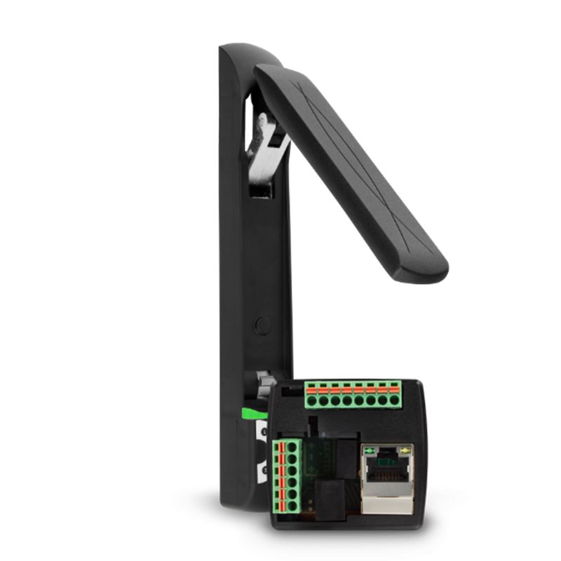 The DoorLock-RA4 is a mechatronic lifting lever for data and server cabinets. The IT cabinet handle in a robust metal-plastic design serves as a folding lever handle. As a result, the handle does not require a swivel range and enables ergonomic handling. The connection is made entirely via patch cables. Ideal for secure, flexible rack access in the data center.