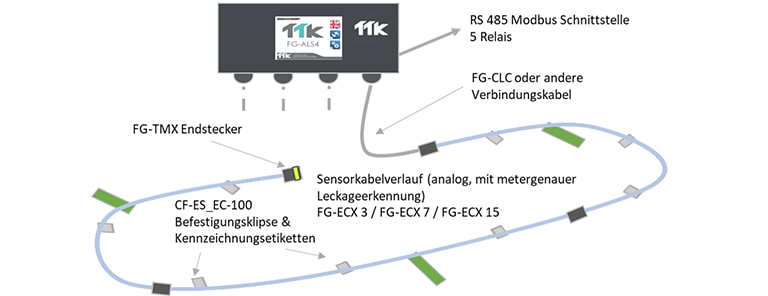 Das Leckerkennungssystem FG-ALS4, eine Alarm- und Ortungseinheit für Lecks in kritischen Bereichen (Serverraum, Lager, EDV-Räume) mit vier Zones, ist für die Verwendung mit den analogen Sensorkabeln von TTK vorgesehen: FG-ECS, FG-ACS und FG-ECX, FG-ACX und dient zur direkten Erkennung und Ortung von Flüssigkeitslecks (Wasser, Basen oder Säuren). Bei Austritt von Flüssigkeit oder einer Störung an den Sensorkabeln in einer Zone reagiert die Einheit wie folgt: Es wird ein akustischer Alarm ausgelöst, und ein Relais wird aktiviert. Auf dem Touchscreen werden der betroffene Zone, der Ort des Lecks (auf einen Meter genau) sowie Einzelheiten zur Störung angezeigt (Art der Störung: Leck oder Kabelbruch). Über MODBUS /JBUS wird schließlich ein Ereignisbericht an das BMS gesendet.